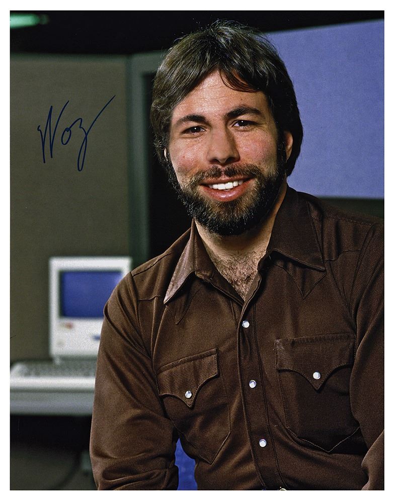 Color satin-finish 11 x 14 head-and-shoulders photo of Apple co-founder Steve Wozniak, signed in blue felt tip, "Woz." In fine condition.