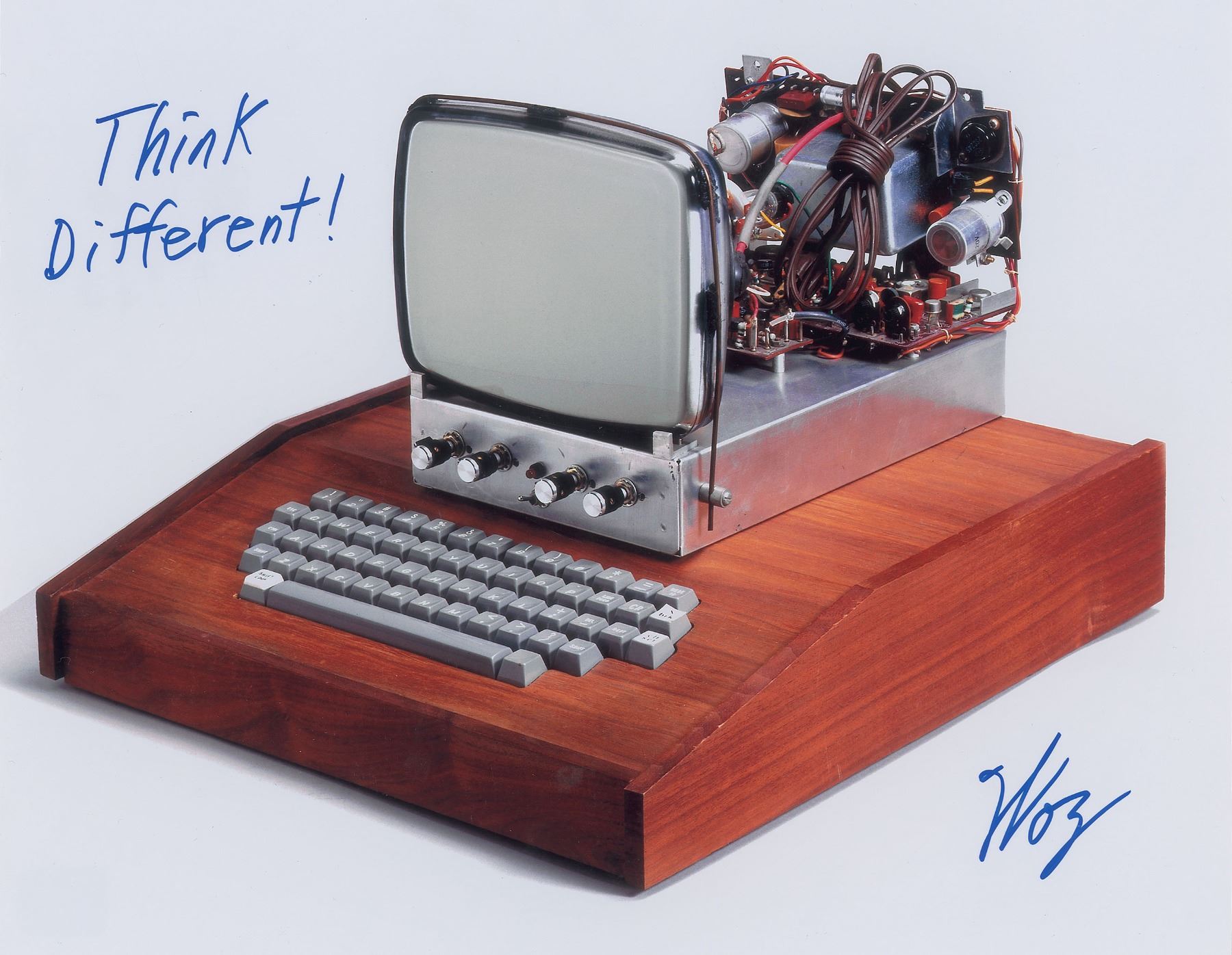 Color glossy 14 x 11 photo of an Apple-1 computer, signed in blue felt tip, "Think Different, Woz." In very fine condition.