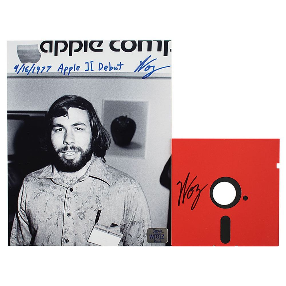 Two items: a glossy 8 x 10 photo of Steve Wozniak at the Apple II introduction event held at the at the West Coast Computer Faire, signed in blue felt tip, "4/16/1977 Apple II Debut, Woz"; and a red 5.25Ë floppy disk signed in black felt tip, "Woz." In overall very fine condition, with an authenticity label affixed to lower right of photo.