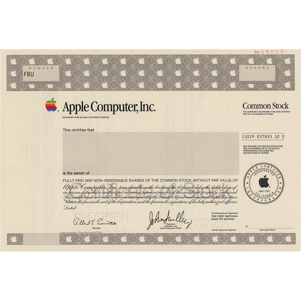 Desirable unissued specimen stock certificate for Apple Computer, Inc., one page, 12 x 8, circa 1988, featuring the pre-printed facsimile signature of chairman, president, and CEO John Sculley. Sculley joined Apple Computer as CEO in 1983, a position he held for a decade. During that period, he was instrumental in developing the market for the Macintosh computer and ushered in the 'first golden age' of the Mac. In fine condition.