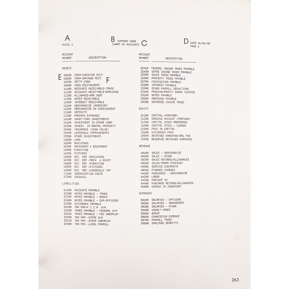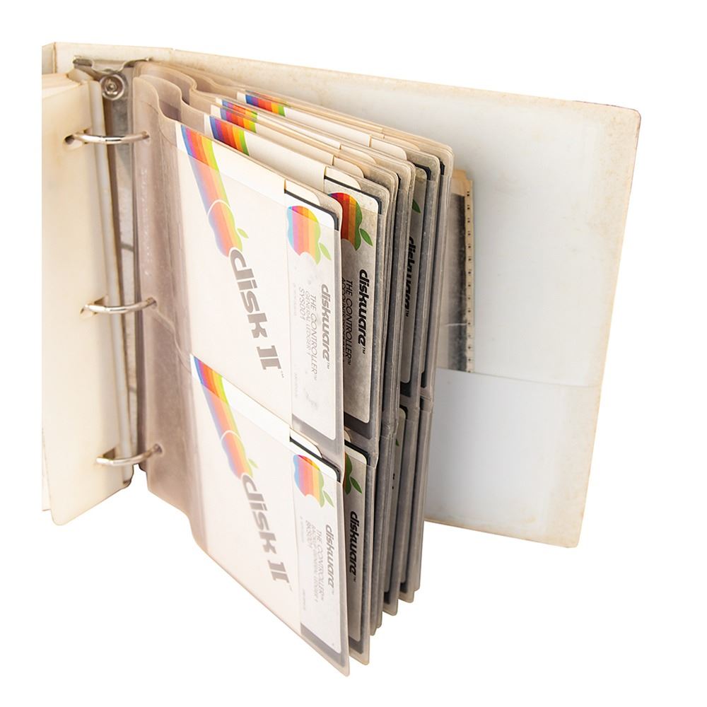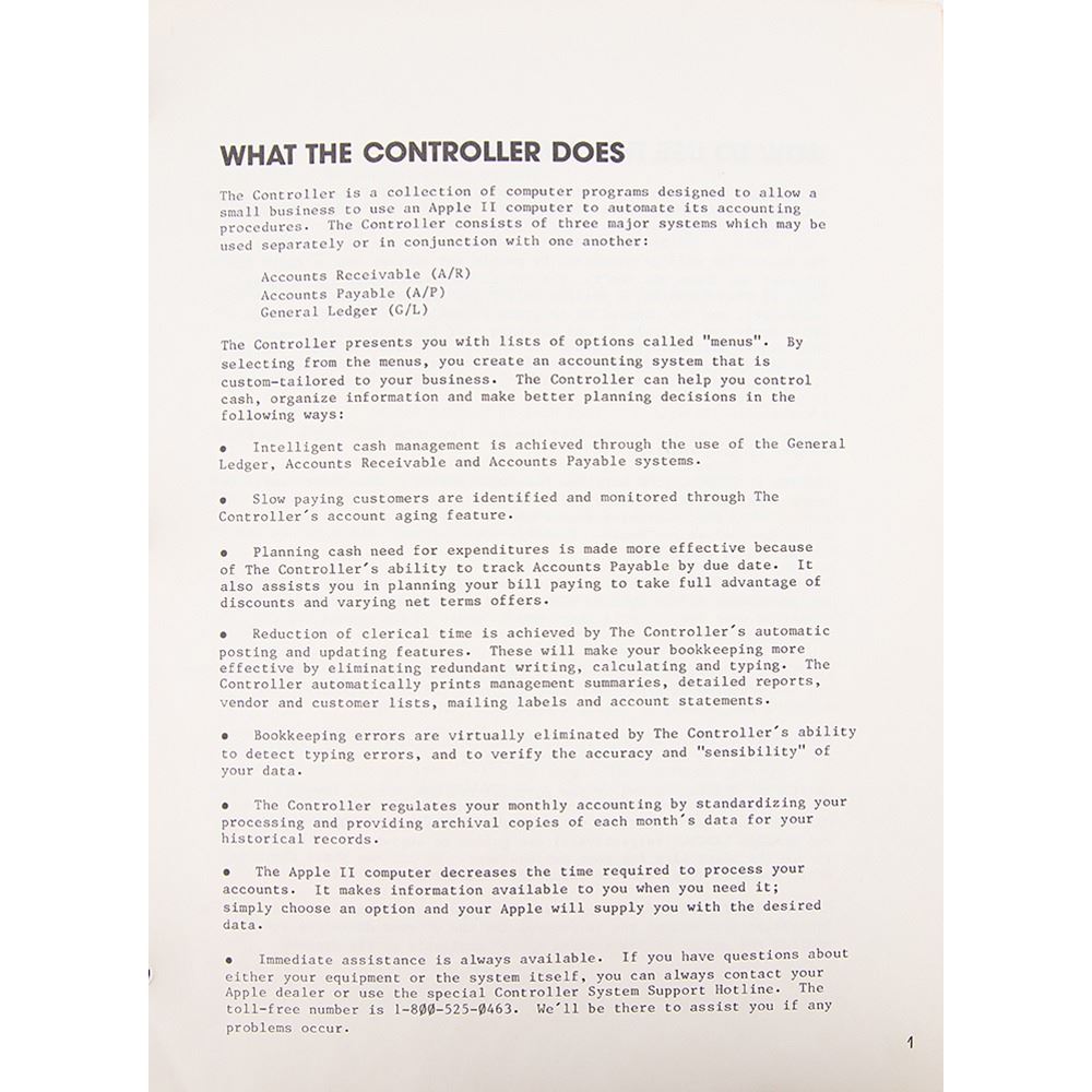 The three-ring binder contains a 281-page user manual and a total of 20 Disk II floppy discs for The Controller software, including “General Ledger 1,†“Accounts Receivable 1,†“Accounts Payable 1,†“General Ledger 2,†“System Master,†“Accounts Receivable 2,†“Accounts Payable Data,†“Accounts Payable 2,†“Accounts Receivable Data†(2), and “General Ledger Data†(2), with all but the latter two with accompanying ‘backup’ discs. The manual’s table of contents features the following sections: Chapter 1: Introduction, Chapter 2: Setting Up the Controller, Chapter 3: Accounts Receivable, Chapter 4: Accounts Payable, Chapter 5: General Ledger, Chapter 6: Setting Up Accounts Receivable, Chapter 7: Setting Up Accounts Payable, Chapter 8: Setting Up General Ledger, Chapter 9: Utilities, Appendix A: Reports, Appendix B: Standards, Appendix C: Menu Map, and Index. In overall fine condition, with scattered toning and soiling to binder and first 'Notice' page, the last manual page detached but present, and the backup disc for 'Accounts Payable Data' seemingly not the original disc.