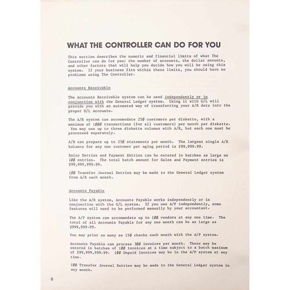 The Controller was a small business management and accounting system consisting of three major sections: accounts receivable, accounts payable, and a general ledger. The program gave business managers an easy and effective alternative to manual bookkeeping and was an early predecessor to QuickBooks.