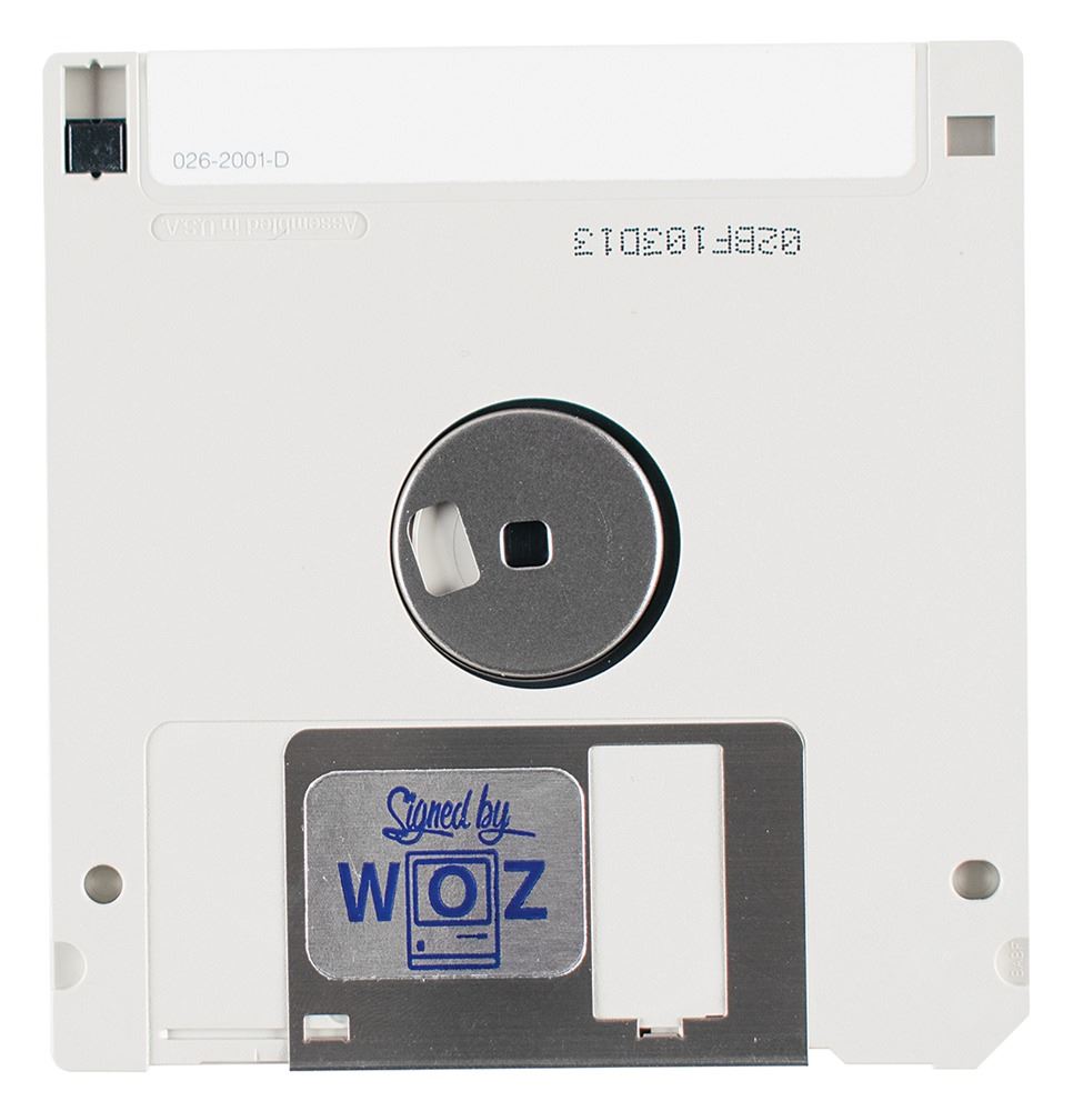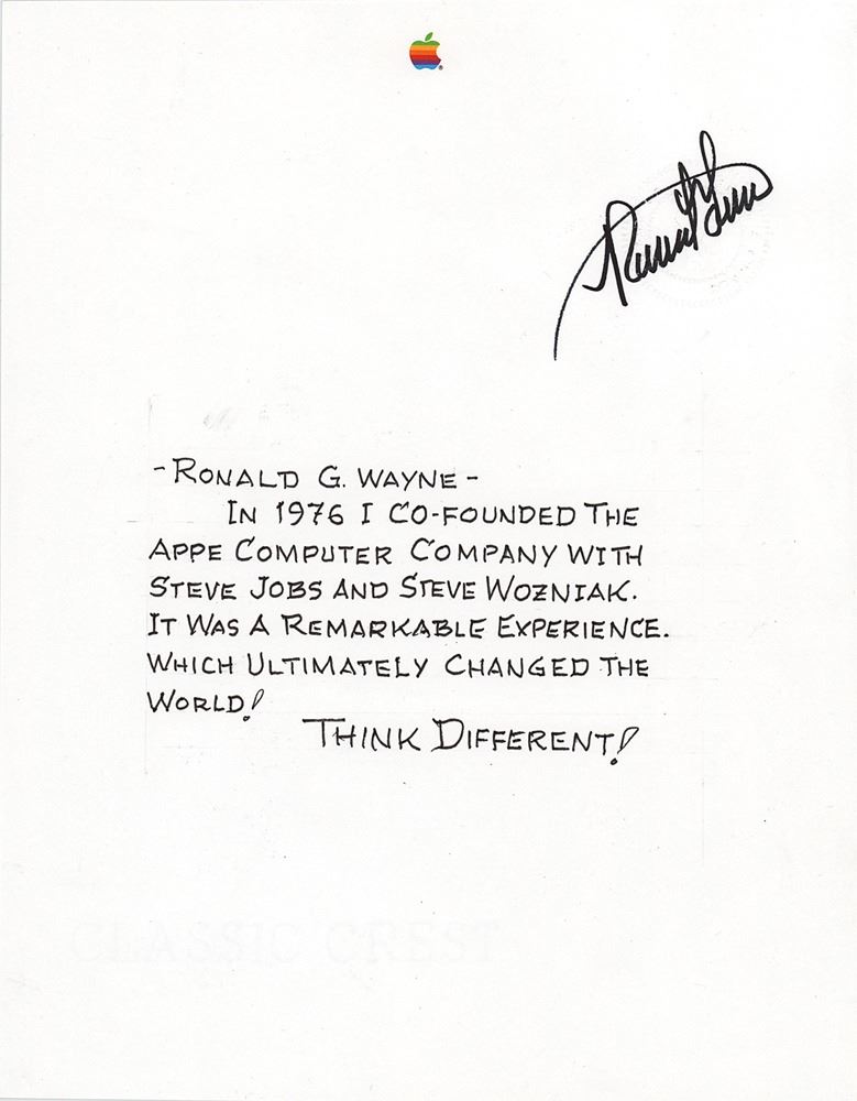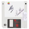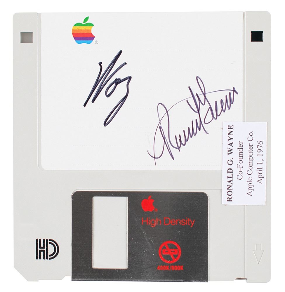 Two items: a desirable Apple high-density 3.5˝ floppy disk, signed on the label in black felt tip by Apple co-founders Steve Wozniak ("Woz") and Ron Wayne ("Ronald G. Wayne"); and an autograph statement signed by Wayne on a white 8.5 x 11 sheet of Apple stationery, in full: "Ronald G. Wayne--In 1976 I co-founded the Appe [sic] Computer Company with Steve Jobs and Steve Wozniak. It was a remarkable experience. Which ultimately changed the world! Think Different!" In fine condition, with a small biographical label applied near Wayne's signature on the floppy disk.