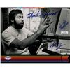 Color satin-finish 10 x 8 photo of the young Woz using a computer, bordered by the colorful Apple logo, signed in blue felt tip by Steve Wozniak, "Think Different! Woz," and by Ron Wayne, "Ronald Wayne," over his embossed personal seal, with small biographical label applied below. In very fine condition, with a PSA/DNA label affixed to the lower left corner. Accompanied by a certificate of authenticity from PSA/DNA.