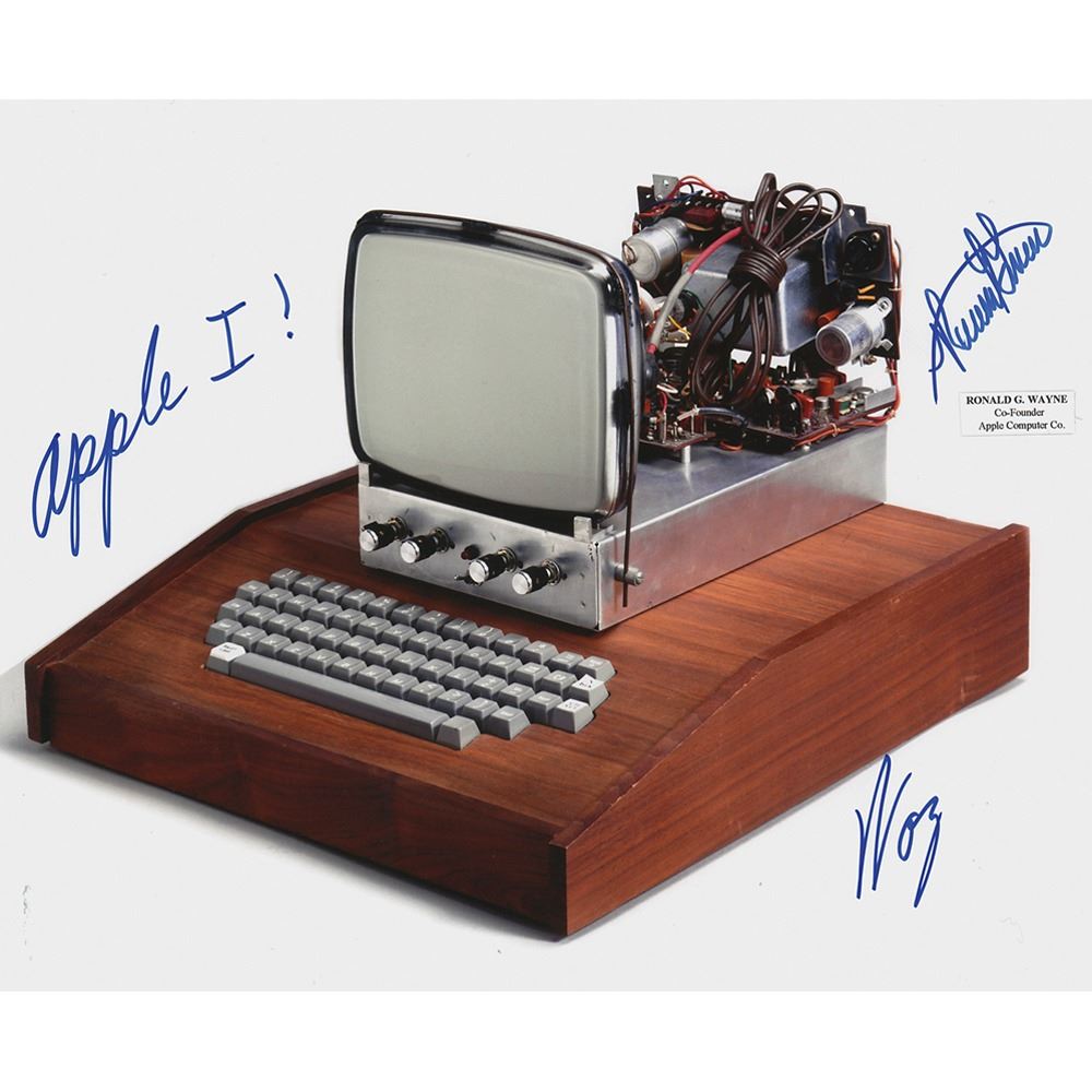 Color glossy 10 x 8 photo of a classic Apple-1 Computer, signed in blue felt tip by Steve Wozniak, "Apple I! Woz," and by Ron Wayne, "Ronald Wayne," over his embossed personal seal, with small biographical label applied below. In very fine condition.
