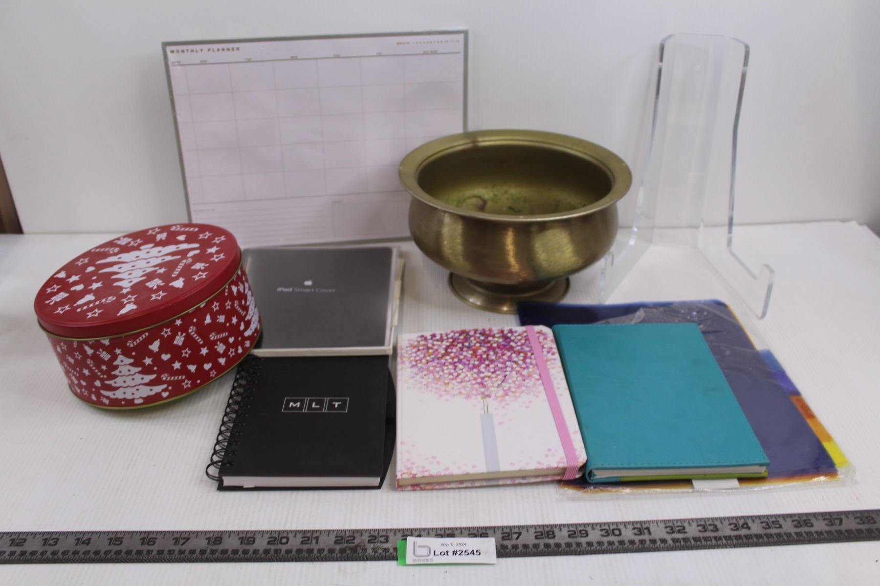 Apple iPad Smart Cover, (3) Notebooks, Monthly Planner, Brass Plant Pot, Christmas Tin 8", Misc.