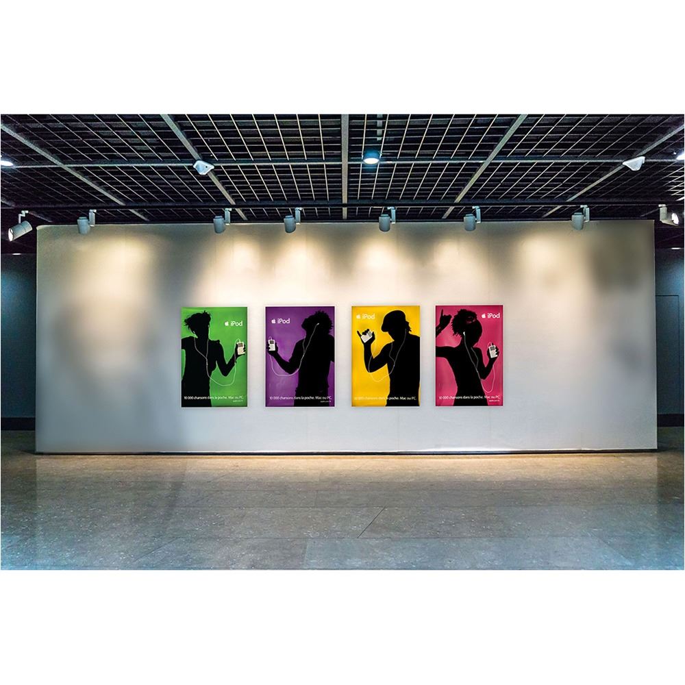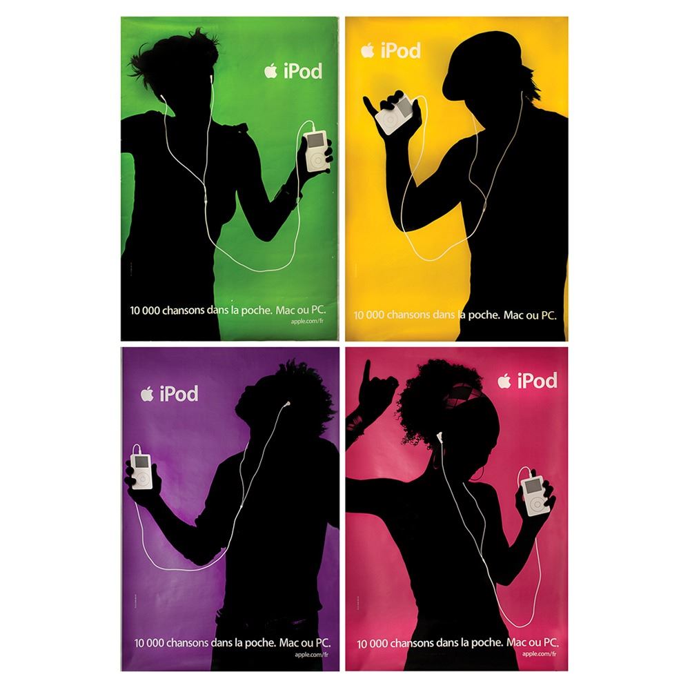 Grouping of four original French-language promotional ‘silhouette’ posters for the iPod by Apple Inc. The posters come in colors of green, pink, yellow, and purple, with each measuring 46.5 x 68.75, and featuring black silhouettes of people using the iPod. The upper corners feature the Apple and iPod logo, and the lower section reads: “10,000 chansons dans la poche. Mac ou PC†[“10,000 songs in my pocket. Mac or PCâ€]. Rolled and in overall fine condition, with some light scattered creases and tack holes to corners; the green poster is in very good to fine condition, with a few instances of surface loss, mounting remnants to reverse, and some small tears to edges.