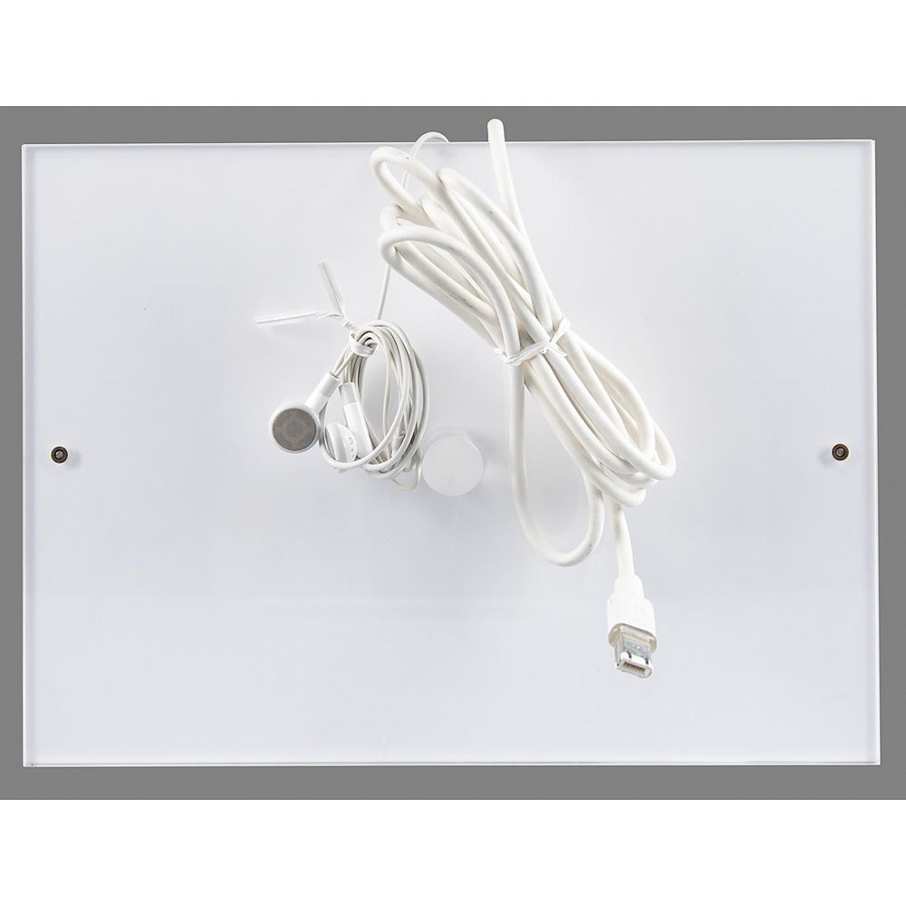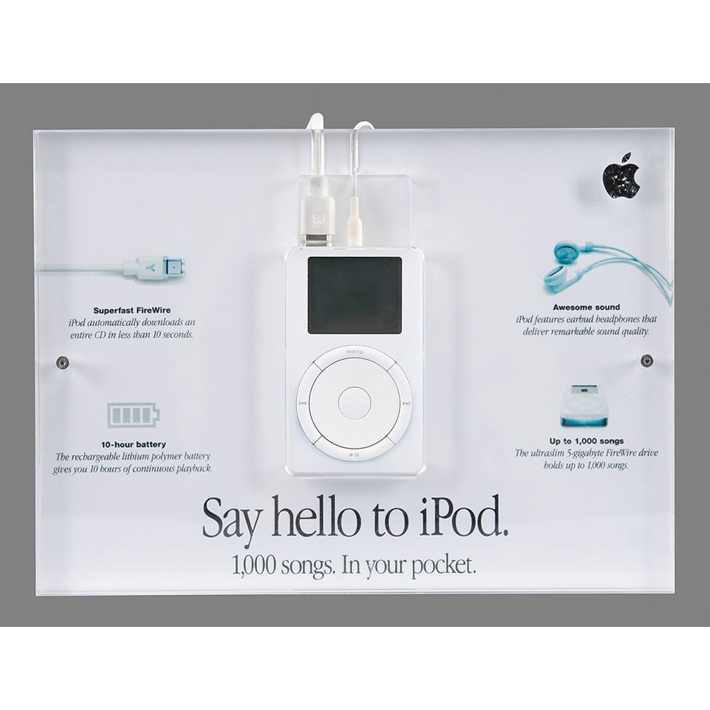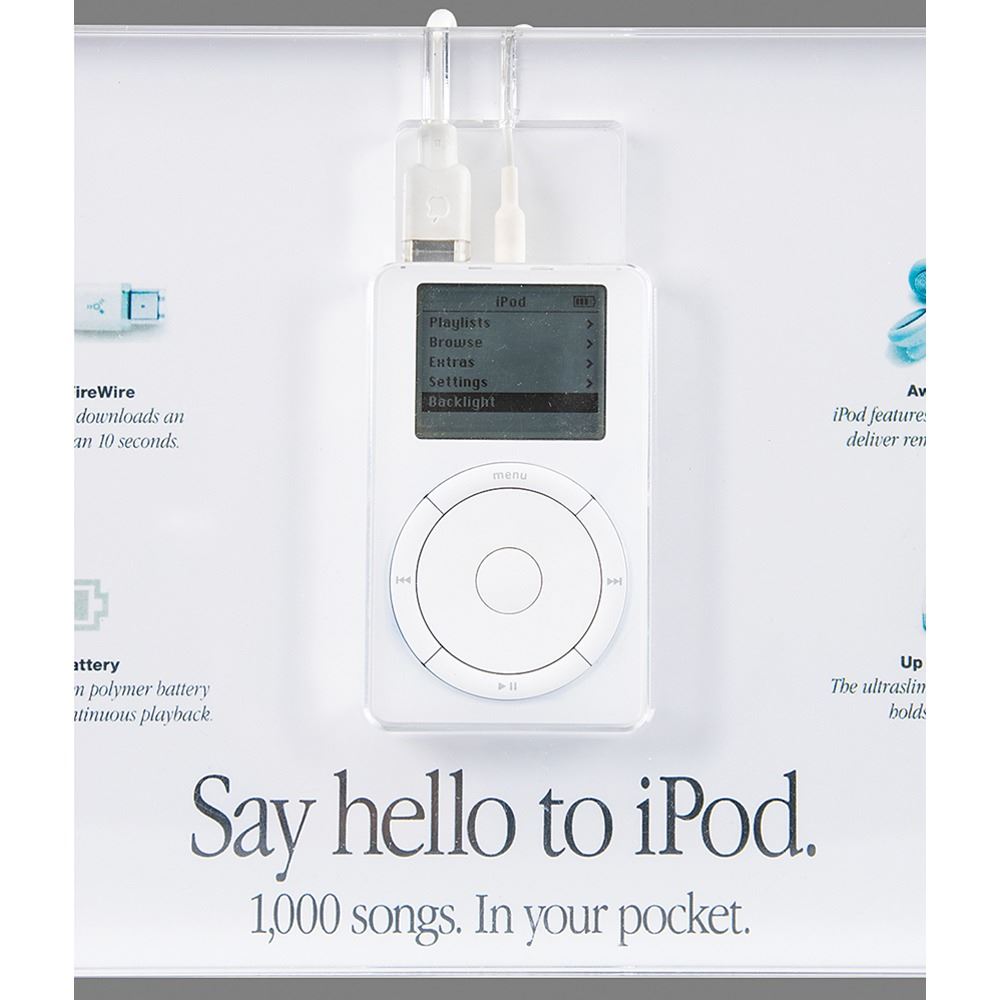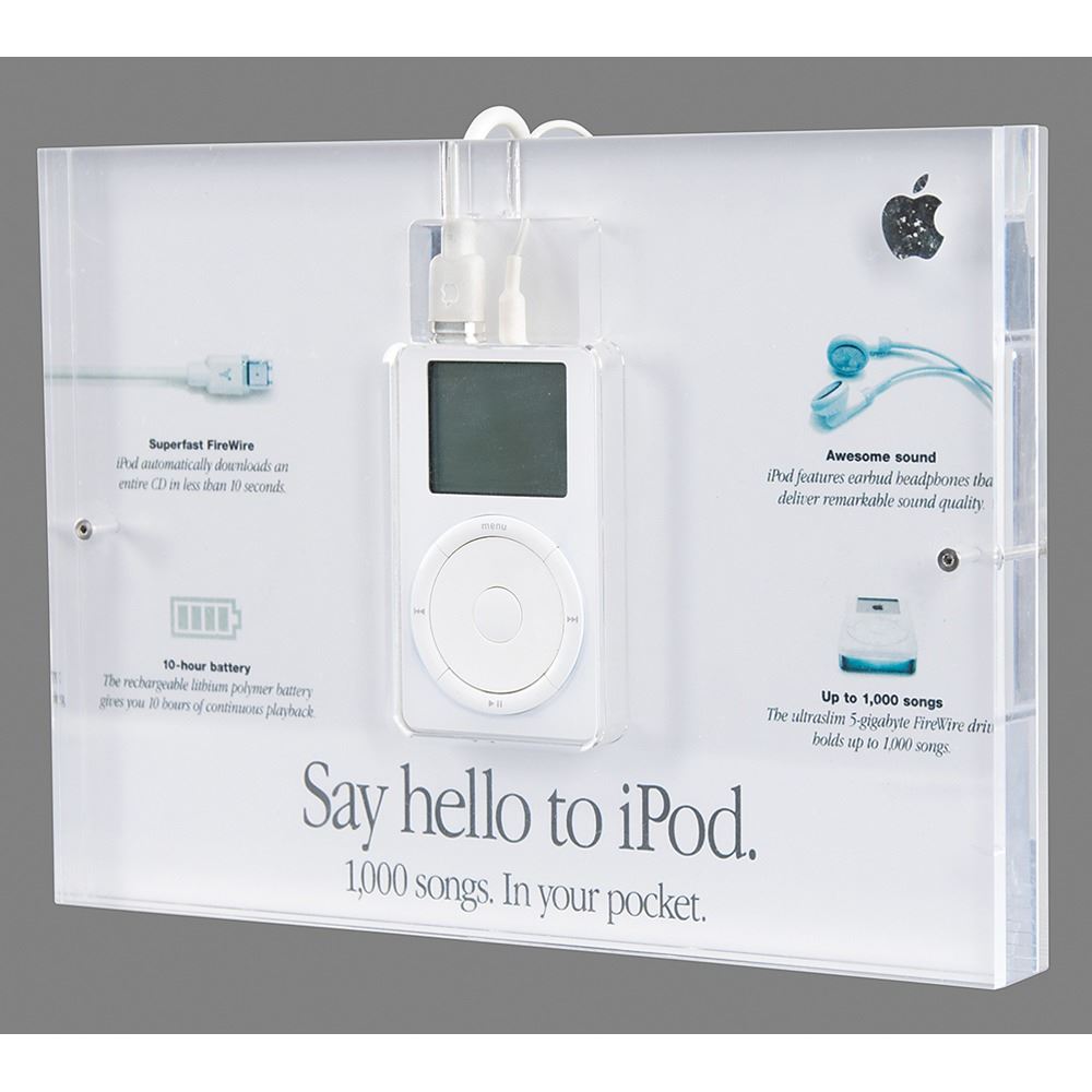 Very rare in-store demonstration display stand for the original Apple iPod (first generation). The 5GB iPod is presented in an acrylic 11 x 8 x 5 holder with an open central window that allows access to the media player controls. The interior features an information sheet with the now-famous slogan, “Say hello to iPod. 1,000 songs. In your pocket,†as well as component statistics for its 10-hour lithium battery, 5GB hard drive, FireWire, and the earbud headphones, the latter two of which are plugged into the iPod through small entry points at the top of the display. Removal of the iPod is possible by unfastening two small screws to either side. Includes a 2001 Apple iPod Power Adapter. The iPod is fully operational and in fine cosmetic condition; the display bears a couple of trivial internal cracks.