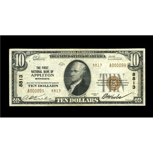 <B>Appleton, MN</B></I> - $10 1929 Ty. 2 <B>The First NB</B></I> Ch. # 8813<BR>Although 18 small notes are listed in the census from here, this is the only Type 2 documented. Plan on a premium bid to add this attractive and scarce item to your collection.