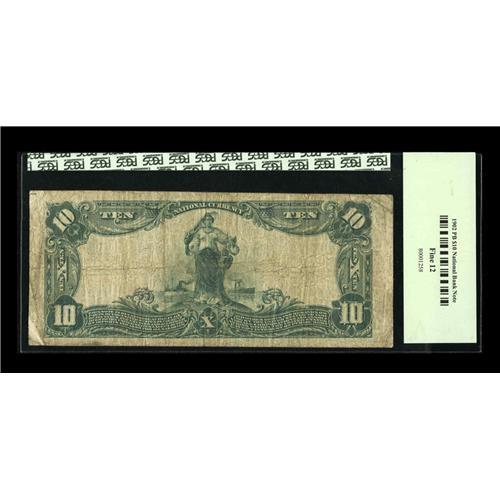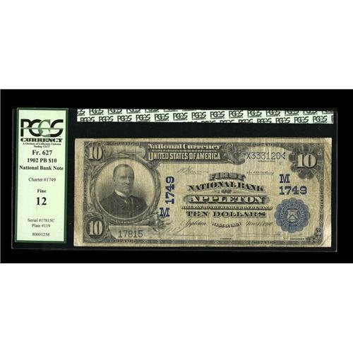 <B>Appleton, WI</B></I> - $10 1902 Plain Back Fr. 627 <B>The First NB </B></I> Ch. # (M)1749<BR>This Outagamie County locale is the home of Lawrence University. Tonight's example is a problem free <B>PCGS Fine 12</B></I>.
