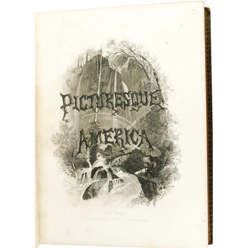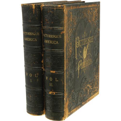 <B>Appleton's <I>Picturesque America</B></I></B></I> <I>Or, The Land We Live In. A Delineation By Pen And Pencil of the Mountains, Rivers, Lakes, Forests, Waterfalls, Shores, Cañons, Valleys, Cities, and Other Picturesque Features Of Our Country. With Illustrations on Steel and Wood by Eminent American Artists.</B></I> original text by Oliver B. Bunce and others, edited by William Cullen Bryant (New York: D. Appleton and Company, 1872-4); in Two Volumes; first edition in book form; viii, 568 pages, vi, 576 pages; illustrated with hundreds of woodcuts and 49 full-page steel engravings; full brown morocco with decorative blind tooling and gilt title, banded spine with gilt titles; marbled endpapers; all edges gilt; thick folio (10.5" x 13"). This ambitious work, edited by the talented poet, lawyer, and journalist William Cullen Bryant, was originally issued by subscription with semi-monthly parts being sent to paid subscribers for later binding into volumes. It is said that it cost Appleton the huge sum (for the day) of $250,000 to produce such a magnificent illustrated work. These stately volumes are divided into chapters with each describing both in word and image the beauty of a different area of our great country. Forty nine full page steel engravings are interspersed throughout the book with cities, towns, and natural wonders as subjects including Niagara Falls, Cleveland (a very early image), the Smoky Mountains, Louisvile, Detroit, Buffalo, St. Louis, Philadelphia, New Orleans, West Point, etc. The engravings from this book are often removed and sold separately (fetching $75-100 each from antique print dealers) so it's getting harder to find these books complete. The bindings show some wear to the leather but are still tight and intact. There is scattered light foxing inside and one engraving has been cut out but is still present. Overall very good.