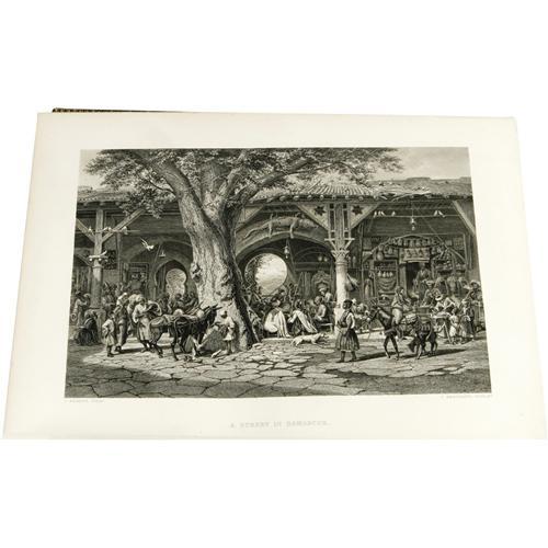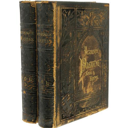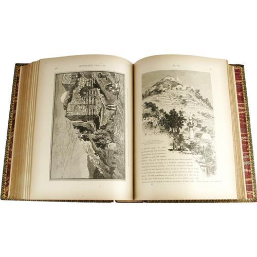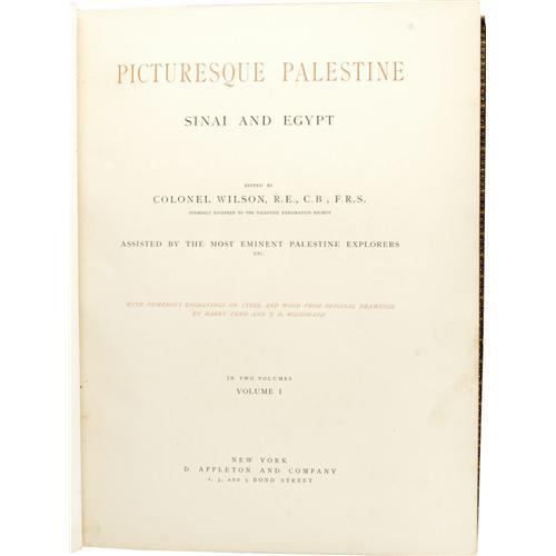 <B>Appleton's <I>Picturesque Palestine, Sinai & Egypt</B></I></B></I> <I>With Numerous Engravings on Steel and Wood from Original Drawings by Harry Fenn and J. D. Woodward</B></I> by Colonel Wilson (New York: D. Appleton and Company, 1881-1883); in Two Volumes; first book edition; x, 480 pages, x, 476 pages; illustrated with several hundred woodcuts, 40 full-page steel engravings, and two double-page color maps; full brown morocco with decorative blind tooling and gilt title, banded spine with gilt titles; marbled endpapers; all edges gilt; thick folio (10.5" x 13"). The Colonel Wilson listed as author is (Major General) Sir Charles William Wilson (1836-1905), who spent a number of years in the Palestine area. He was born in Liverpool, obtained his commission in the Royal Engineers in 1855 and was sent to Jerusalem in 1864 to do a topographical survey of the area. His various duties carried him all over the Middle East and he won many awards and acclaims for his archaeological and geographical work there. These volumes are well written and profusely illustrated, covering many important areas of interest to the biblical scholar including Jerusalem, Bethlehem, Galilee, and Damascus, and also the great landmarks of Egyptian history including the Pyramids and Luxor. The bindings show wear and the front covers are loose but still attached. Internally, the pages are clean with only a tiny bit of occasional foxing. Overall very good. The third and last in the "Picturesque" series from Appleton- we are proud to offer the complete collection in matching bindings.