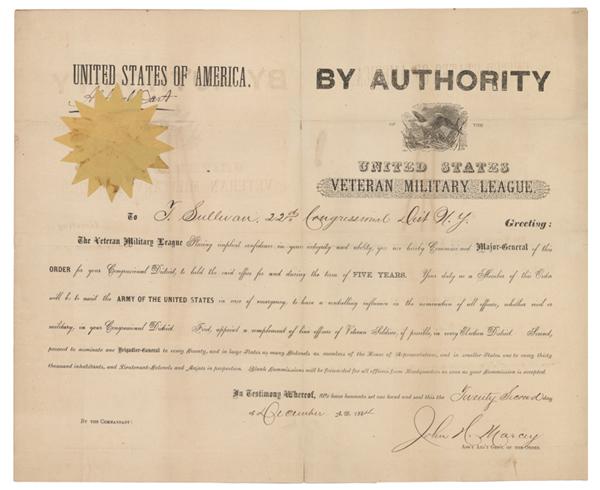 Partially Printed Document. One page, 17” x 14”. No place. December 22, 1864. Image of an eagle perched atop flags at upper right. Yellow paper wafer seal affixed to upper left. The document commissions “T. Sullivan 22d Congressional Dist. N.Y.” as a Major-General charged with “assist[ing] the ARMY OF THE UNITED STATES in case of emergency …” This unusual item appears to be a commission for a league that was formed in order to provide a ready source of reserves for the Union Army during the Civil War. Minor toning. Else Fine.