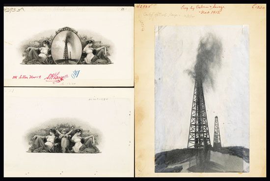 California, 1912. Lot of 2 different proof vignettes and the model photograph for the gushing oil well used in the middle of the vignette. 5.75 x 8 inch photograph of a gushing oil well has been touched up with watercolors for use as the central vignette flanked by 2 allegorical women. Notation ÒEngraved by Osborn & Savage, Nov. 1912Ó on top. Also included is the original well known vignette of a little girl holding 2 torches flanked by 2 allegorical women and the final version with the gushing oil well replacing the little girl. Approval signatures on the altered proof vignette and archival date stamps. Rare proof vignette production file. ABNC. All are VF to XF condition.