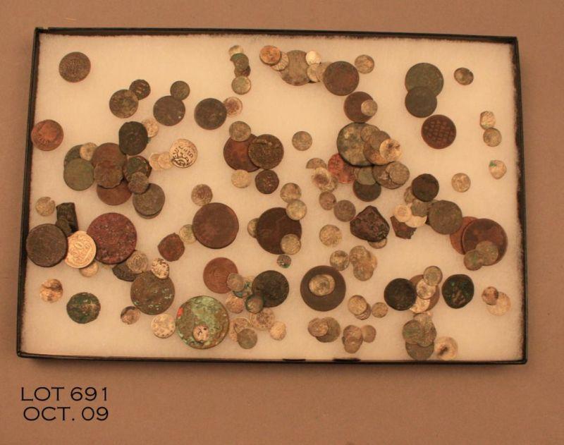 Approx. 100 ancient and antique foreign coins in a riker case including mostly dug ups. A very interesting lot that may include some real sleepers! Est.: $100-$200.