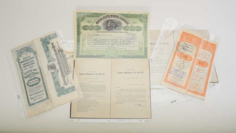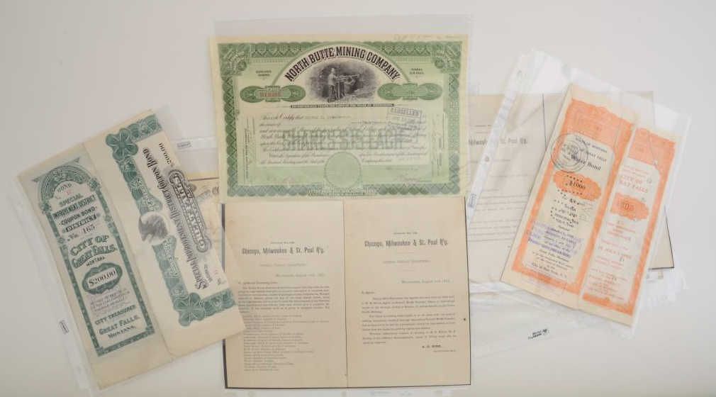 Approx. 12 misc. documents, primarily mining stocks, special district and refunding bonds with beautiful artwork including a North Butte Mining Co. Stock, New Monarch Mining Co. Stock, Ohio & Colorado Smelting &Refining Co. Stock, Cal-Ariz Copper Co., Big John Mining Co., Tuolumne County Water Co., City of Great Falls, MT. Special Improvement, Water and Re-Funding bonds and 6 Chicago, Milwaukee & St. Paul R’y Agent Circulars alldated in 1885. Est.: $50-$75.