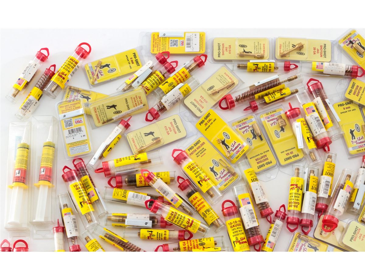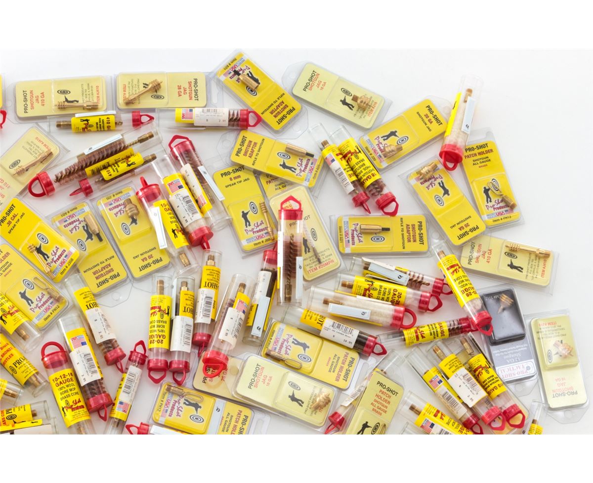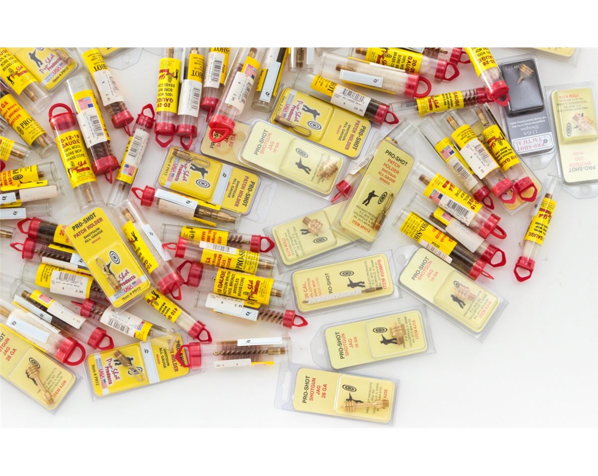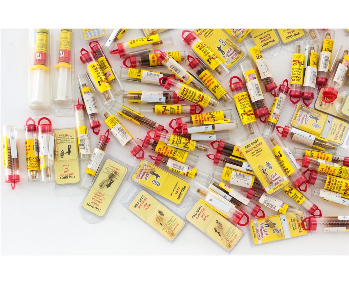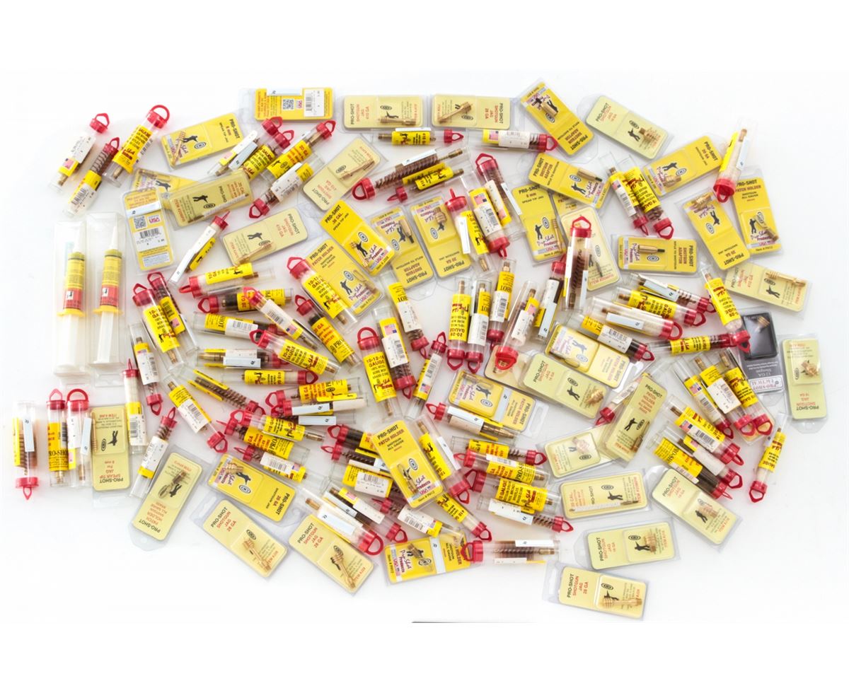 Approx. 125 Pro-Shot Cleaning Brushes, Choke Tube Lubes, Spear Tip Jags, Shotgun Jags, and Patch Holders. For most gauges. All brand new in original packaging. Est.: $200-$250/lot. (Field Time)
