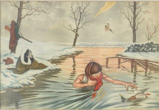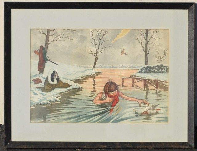 Approx. 14” x 21” original watercolor on paper signed lower right but illegible as in pencil other than possible O.K.I.N.I. but does not make sense; by legend, a gift from Disney artist to Robert E. Petersen, showshunter retrieving his own Duck from frozen water while his dog wears his coat. (Angus, are you watching this one!). From the estate of Robert Petersen. Est.: $300-$600.