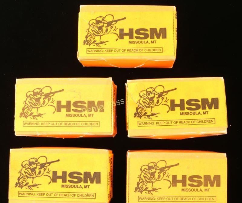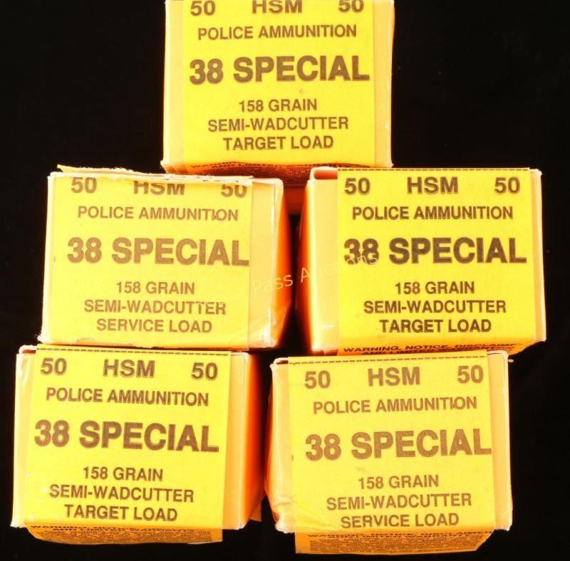 Consisting of five 50 round boxes of HSM Police Ammunition 158 grain semi-wadcutter target loads. May contain a partial box.