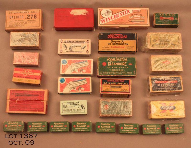 Approx. 30 boxes of collectible ammunition, some full, some partial including UMC partial box for .44 Winchester; nine boxes of Remington Kleanbore .22 Short; one box of Navy Arms .41 RF short; .32 RF by Peters (red box with cartridge picture);Winchester .30 Army; hard-to-find 250 rounds of Winchester .22WRF limited edition; U.S. Cartridge Co. .38 RF short, etc. Est.: $300-$500.