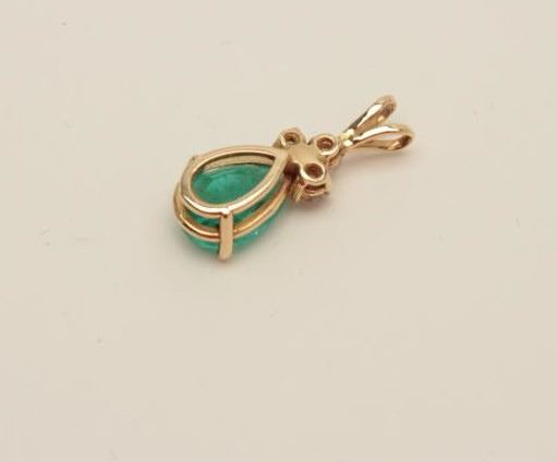 Approximately 1.25-1.5ct Pear Shape Natural Bright Green Emerald mounted in 14K Yellow Gold Pendant with 3 accenting Diamonds. Above Average Color and Clarity. Retail Replacement value $3,800. Est:$1,250-2,500