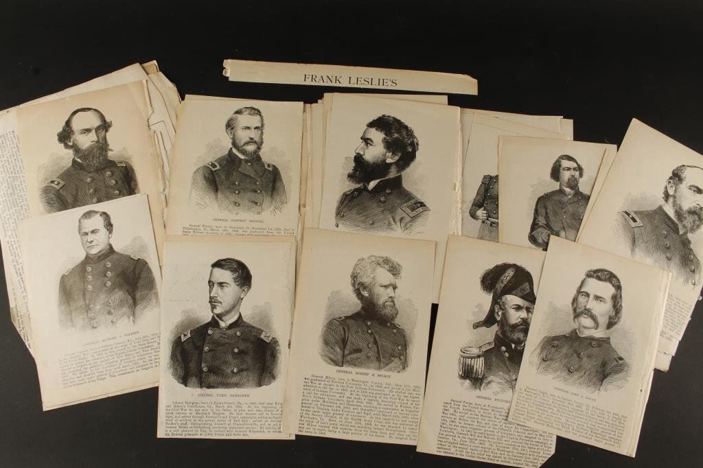 Approximately 50 Civil War Generals’ portrait litho prints from original Frank Leslie’s “Illustrated Newspapers” of the 1860’s. Est.: $50-$75.