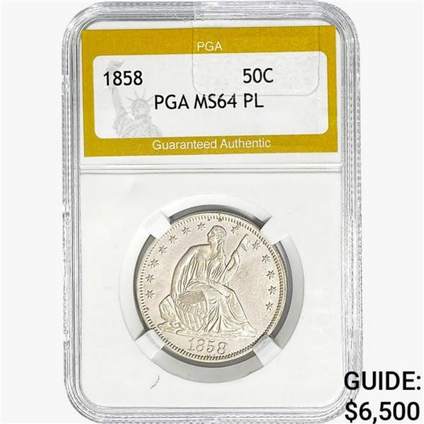 1858 Seated Liberty Half Dollar PGA MS64 PL