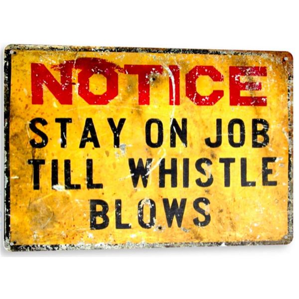Notice - Stay On Job Till Whistle Blows metal pub bar sign. 8" X 11" with pre-drilled holes for mounting.Â