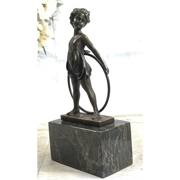 Little Girl Playing With A Hoop sculpture. Lost wax casting method bronze, with brown patina, mounted on a marble base. 10" H X 5" W. 8 lbs.