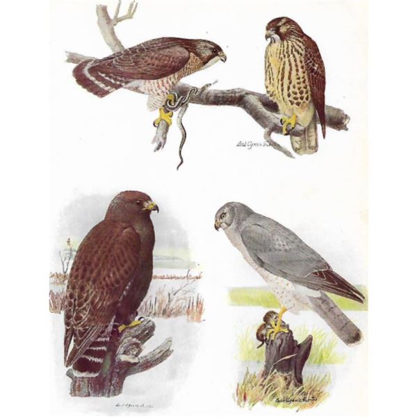 1936 Pearson Birds, #34 Hawks-1 (Broad-Winged, Rough-legged, Marsh).  8"x11" Comes with mat board. Birds of America. T. Gilbert...