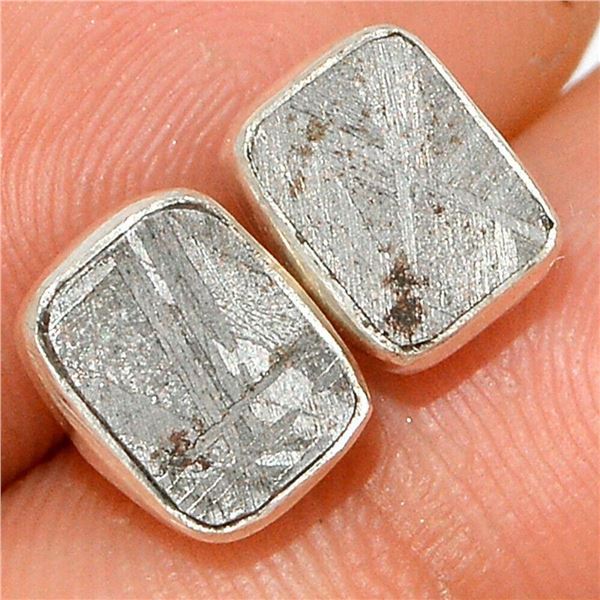 Pair of rectangular cut slices of Muonionalusta Meteorite from Sweden, set into stamped 925 sterling silver post earrings. 1.9 grams