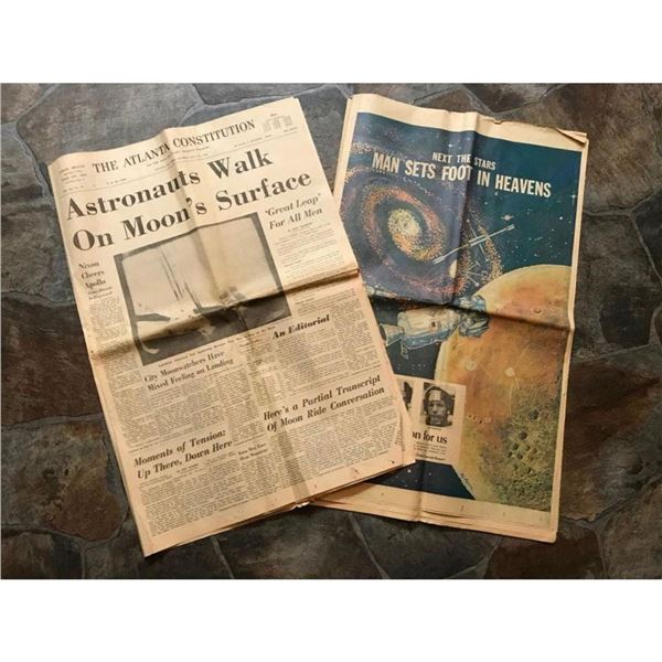 Two rare 50 year old newspapers covering the astronauts landing on the moon. The Atlanta Constitution July 21, 1969 with headline, Astronauts Walk On
