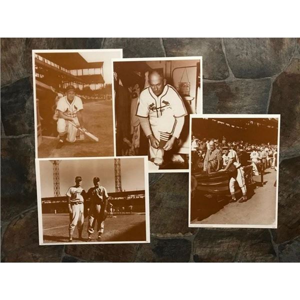 Group of four sepia-tone photo prints of the 1946 Baseball World Series, including; Cardinals Coach, Joe Giragiola, Enos Slaughter on one knee leaning