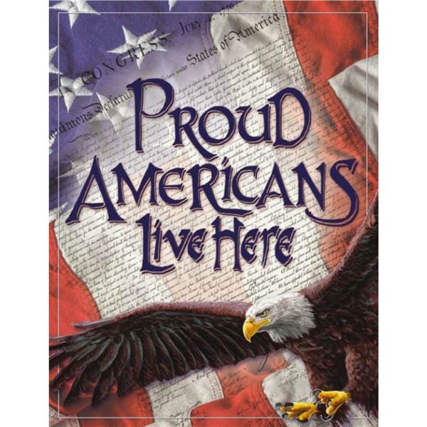 "Proud Americans Live Here" metal pub bar sign. 12 1/2" X 16" with pre-drilled holes for mounting.Â