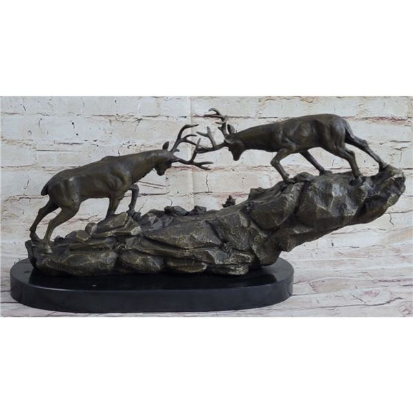 After Barye, Fighting Stags, Deer, Elk sculpture. Lost wax casting method bronze, with brown patina, mounted on a marble base. 10" H X 20"...