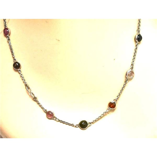 39.68ctw multi-color tourmalines set in 925 sterling silver stations, 36" necklace. 21.7 grams.