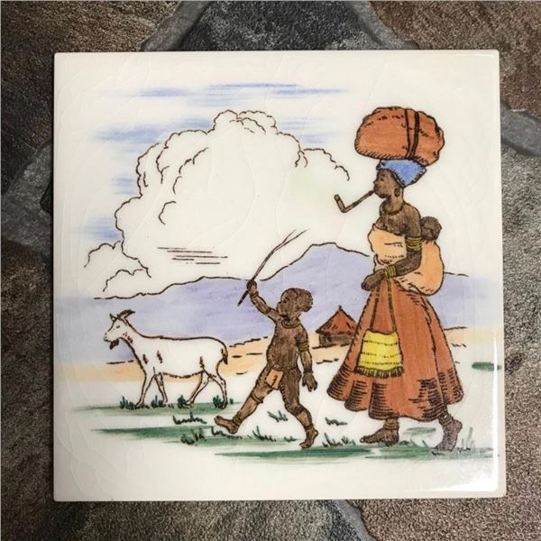 Vintage & rare hand-painted tile, made in England by Pilkington, Pilkington's Group, depicts an African village scene, woman & child. 6&...