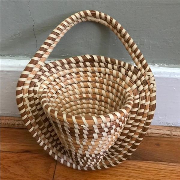 Lowcountry hanging Sweetgrass Wall Pocket Basket, created by an artisan at the market in Charleston, South Carolina.
