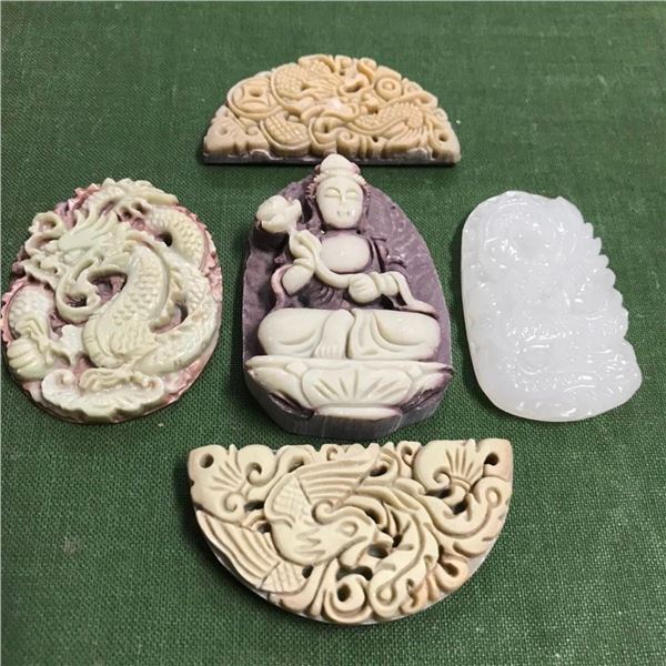 Group of four Asian carved stone & composite pendants, decorations - dragon, phoenix & Quan Yin, for jewelry making, hobbyist. 1 ...