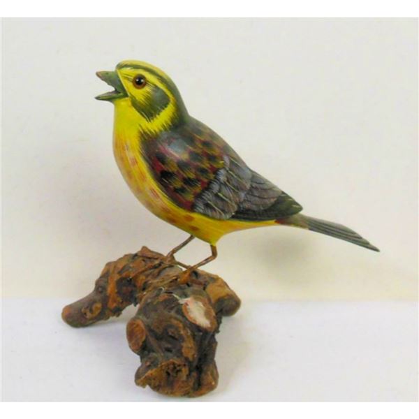 Hand-painted carved wood bird, yellow finch, with glass inserted eyes, & wire legs mounted on a natural root base. 5 1/2" H X 6 1/2" W...