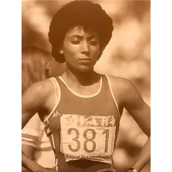 Sepia-tone photo print of famous track and field athlete, Olympian, Florence Griffith Joyner in the 1984 Los Angeles Olympics. Create