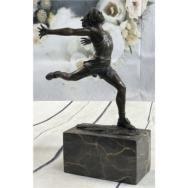 Track, runner, Olympics trophy style sculpture. Lost wax casting method bronze, with brown patina, mounted on a marble base. 11" H X 10" W...