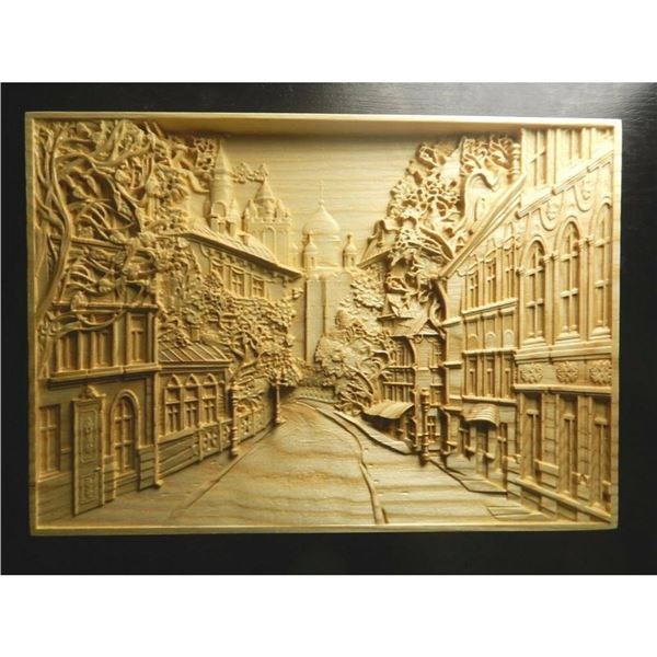 Street of an old town, carved wooden plaque. Carved from ash tree wood by a Lithuanian artisan & finished with Danish oil. 7" X 10".