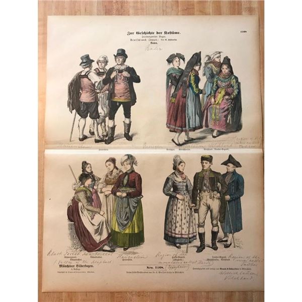 Rare 19th Century costume plates, double-page book plate, hand-colored engravings from a German book, "Zur Geschichte Der Costume". Depict...