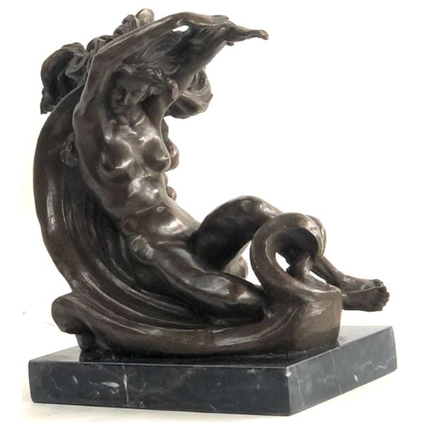 After Joseph Reiner, Goddess Venus in Waves sculpture. Lost wax casting method bronze, with brown patina, mounted on marble base. 12"