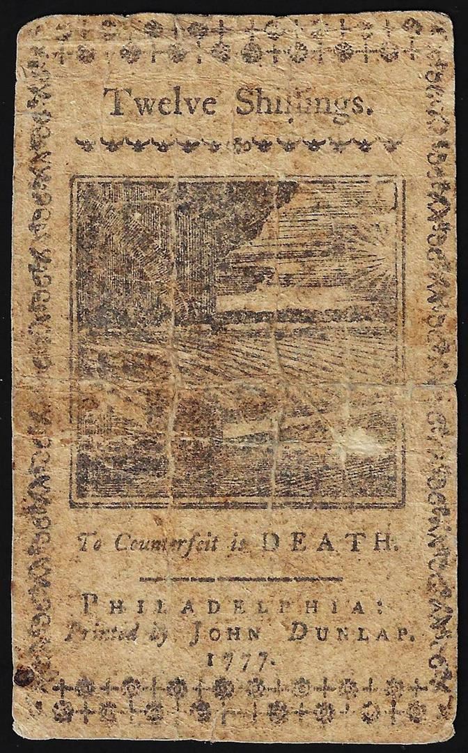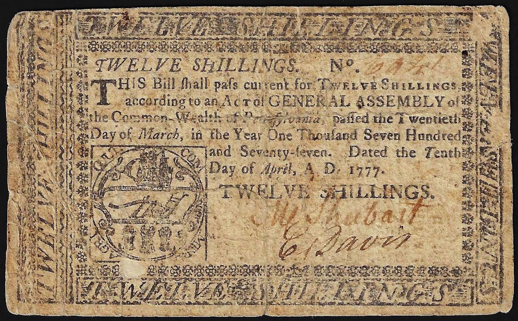 One April 10, 1777 Pennsylvania 12 Shillings Colonial Currency Note.