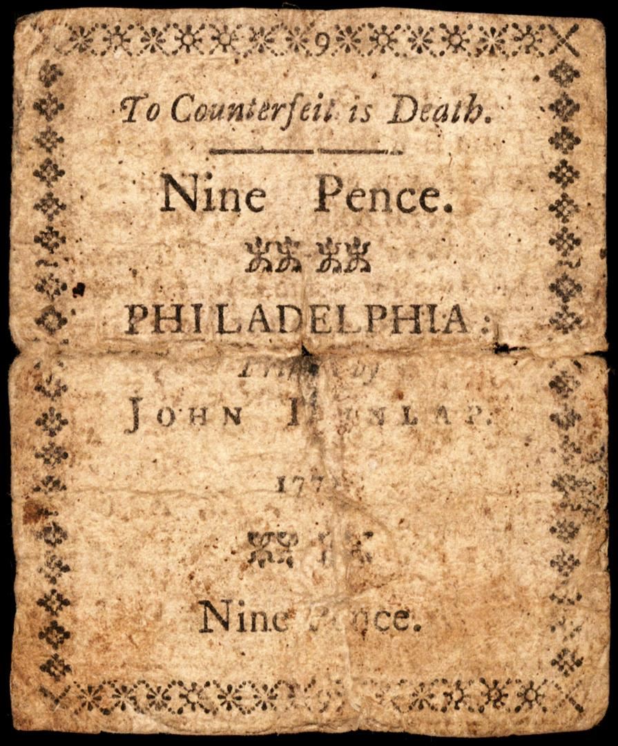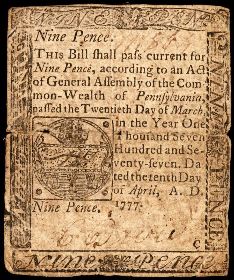 One April 10, 1777 Pennsylvania Nine Pence Colonial Currency Note.