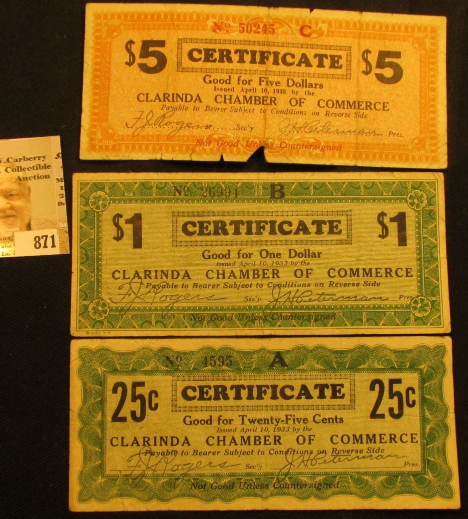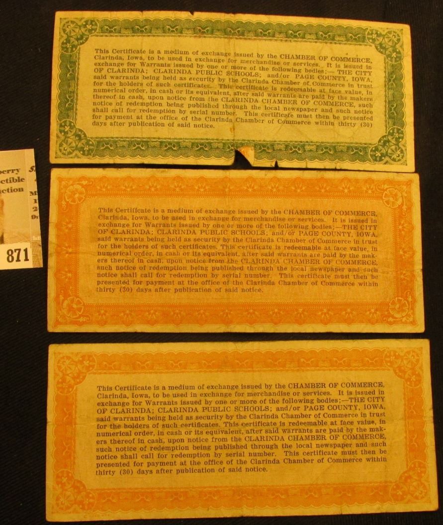 April 10th, 1933 Clarinda, Iowa Depression Scrip Three-piece Set. MS #: IA220-.25A, 1, & 5A. Each