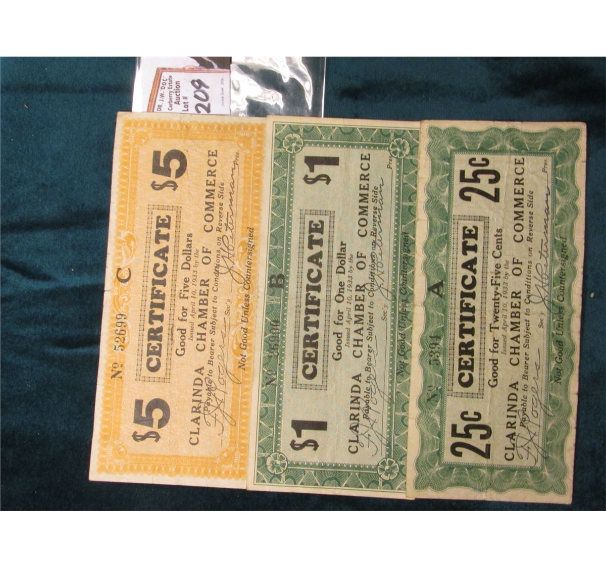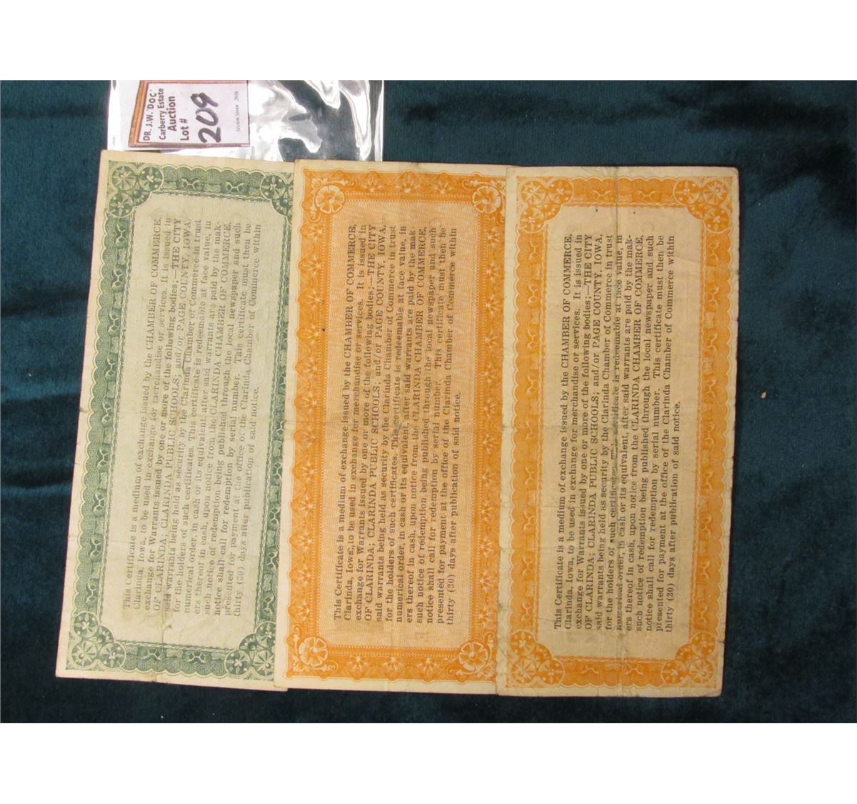 April 10th, 1933 Clarinda, Iowa Depression Scrip Three-piece Set. MS #: IA220-.25A, 5A, & 1. Each