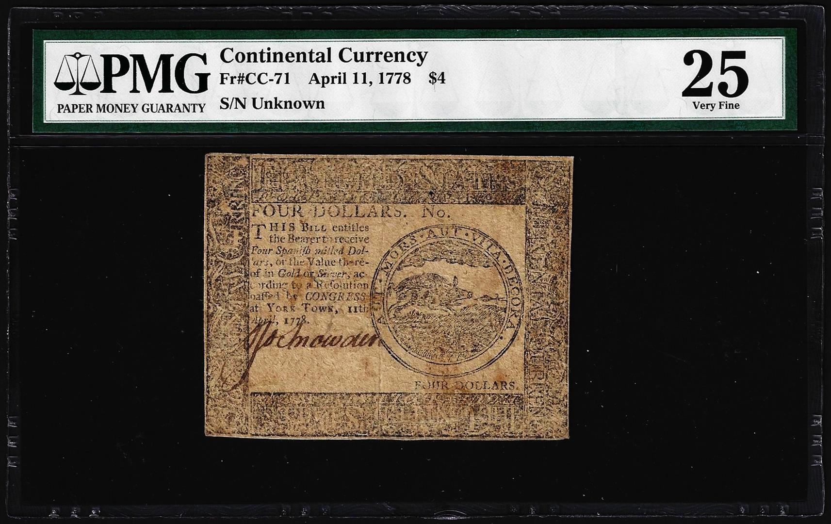 April 11, 1778 $4 Continental Currency Note Fr. CC-71 PMG Very Fine 25
